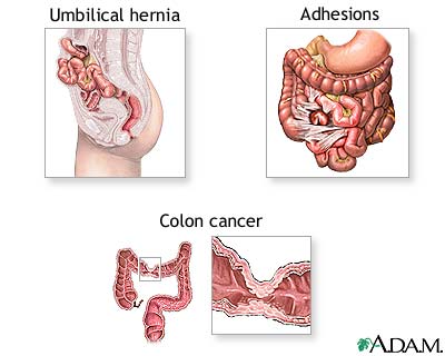 The most common causes of intestinal obstruction in adults are adhesions, hernias, and colon cancer. Adhesions are scars that form between loops of intestine, usually caused by prior surgery, which causes such scar formation. Hernias are areas of weakness in the abdominal wall, through which loops of intestine can slip and become trapped. Colon cancer is one of the most common forms of cancer. While each reason for intestinal obstruction requires a different treatment, all intestinal obstructions are potentially life-threatening.